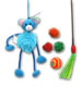 先端にリボンや鳥の羽根、ウサギの毛などでヒラヒラするように作られたものが付いているオモチャです。消耗品でいくらでも要るでしょう! その他にボール状のものも良いと思いますが、小さなボールよりある程度大きなほうが行方不明にならず良いでしょう。